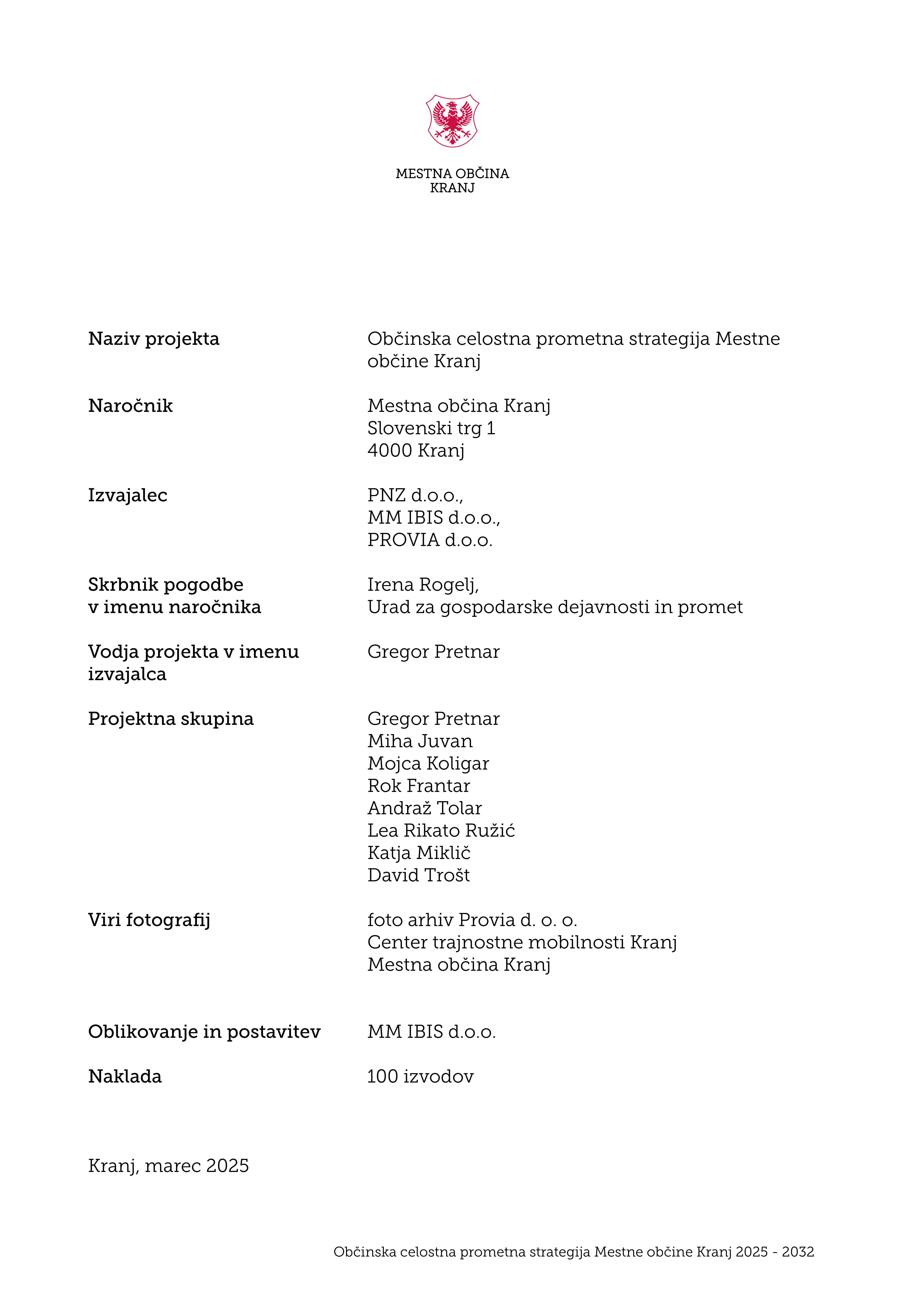 Občinska celostna prometna strategija Mestne občine Kranj je najpomembnejši strateški dokument, ki omogoča dolgoročno načrtovanje trajnostne mobilnosti, izboljšanje dostopnosti in višjo kakovost bivanja. Z njenim sprejetjem občina utrjuje svojo vlogo kot napredno in trajnostno usmerjeno mesto, ki se uspešno prilagaja sodobnim prometnim, okoljskim in družbenim izzivom. Vizija temelji na varnem, dostopnem in učinkovitem prometnem sistemu, ki spodbuja hojo, kolesarjenje in javni prevoz. Ključni cilji so večja varnost vseh udeležencev cestnega prometa, izboljšana kakovost življenja v privlačni, zeleni in povezani skupnosti z zmanjšanjem negativnih vplivov prometa ter izboljšana dostopnost do osnovnih storitev.